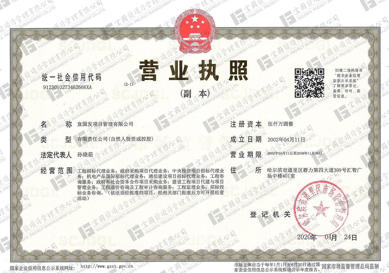 宜國發項目管理有限公司(原名黑龍江國發項目管理有限責任公司)成立于2002年4月,公司注冊資金5000萬元人民幣,具有獨立法人資格?,F具備國家住房和城鄉建設部頒發的工程招標代理機構甲級資質,發展和改革委員會頒發的中央投資項目招標代理機構甲級資質、財政部頒發的政府采購代理機構甲級資質,黑龍江省住房和城鄉建設廳頒發的工程造價咨詢企業甲級資質,并已納入全國投資項目在線審批監管平臺工程咨詢單位備案名單、“中國政府采購網”政府采購代理機構名單及“中國國際招標網”機電產品國際招標代理機構名單,且通過了質量管理體系、環境管理體系、職業健康安全管理體系認證。